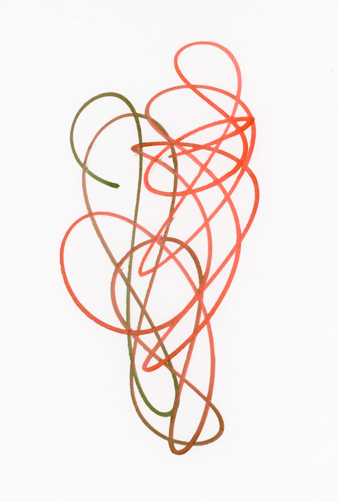 I just uploaded a whole bunch of new work to the drawings page. I am calling these tricolor because I filled a pen (empty Molotow 227) with a bright orange acrylic ink, then dipped the tip in a dark green ink. The effect is that the line starts our dark, mixes with the orange and then becomes orange. It allows me to use different colors without breaking the line or using multiple lines. Some of the drawings from 8/5/12 are multi-line but everything from 8/10/12 is single line with the colors mixing on the pen nib. Prior to now I had just been diluting my normal paints with water for use in the pens. It worked really well with some of the mop pens but I had not had a whole lot of success with the Molotows, which otherwise I liked because they have very even flow with not much drip. The watered down paint was just not bright enough. These “acrylic inks” are pretty bright though and the color is very even. These were all done on two days, August 5th and August 10th of 2012. Here are some of my favorites from the set (click on any of the images to go into the set or click here for the drawings page):